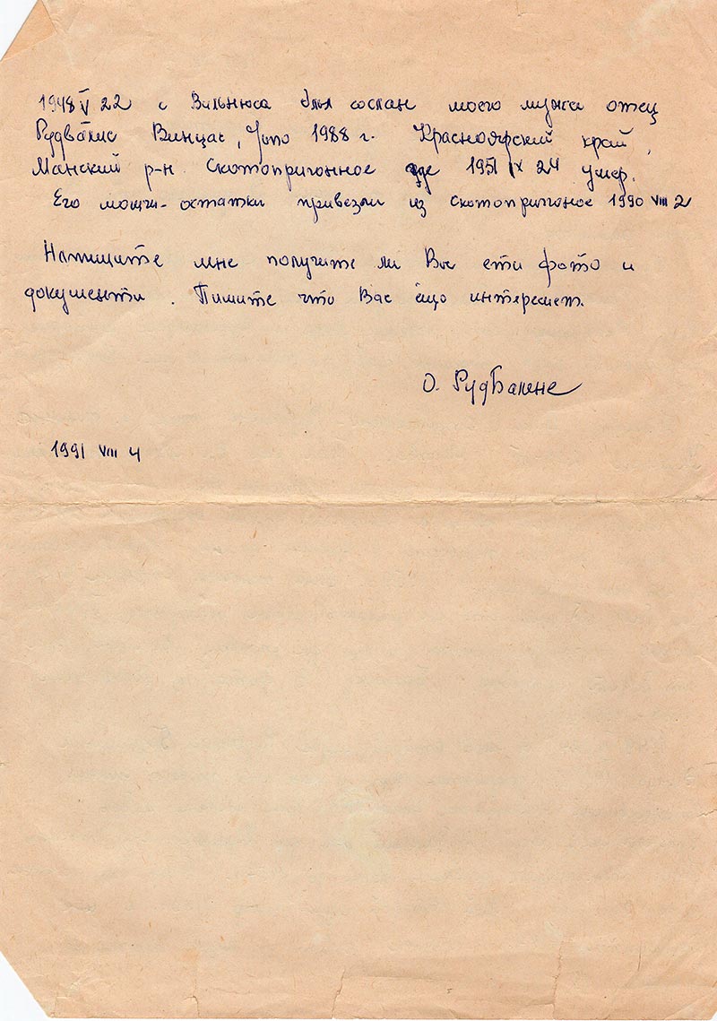 1949 III 24 я, мой второй муж Рудвалис Гедиминас Винцо 1911 г. (документах 1906) и сын от первого мужа Станкевичюс Алгимантас Ионо 1040 были сосланы Сибирь Красноярский край, Ирбейский р-н дер. Кромка к-з «Шевченко». Там тежелейших условях жили до 1957 г. Там была сослана около 30 семей. Мой второй муж умер 1983 г. о сын Алгимантас 1984. Вильнюсе живут два внука, однаму 26, о другому 18.