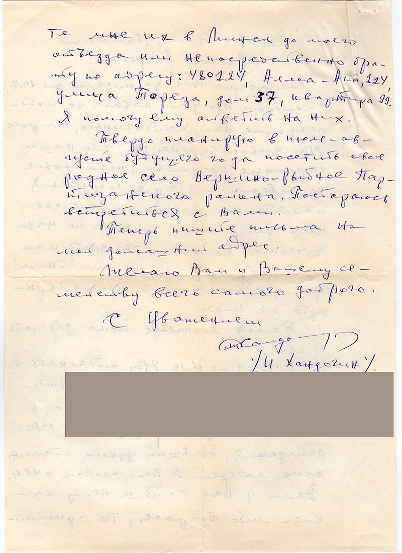 Алексей Андреевич, и последняя к Вам просьба /совершенно незначительная/: в связи с тем, что у меня в семье нет правильного понимания необходимости посылки денег на названный памятник, то убедительно прошу Вас дать мне ответ на это письма до востребования по такому адресу: 220113, Минск-113, до востребования Хандогину Ивану Федоровичу.