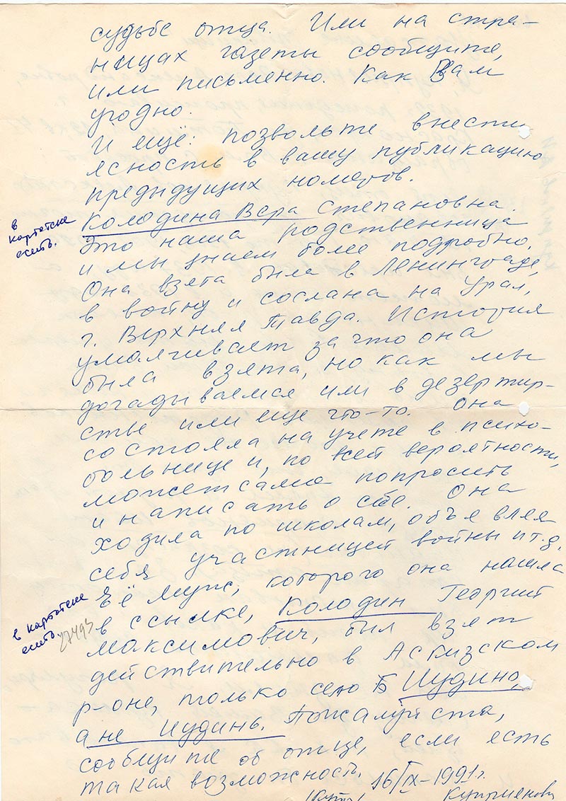 (комментарий: в картотеке есть) Колодина Вера Степановна. Это наша родственница и мы знаем более подробно. Она взята была в Ленинграде, в войну и сослана на Урал, г. Верхняя Тавда. История умалчивает за что она была взята, но как мы догадываемся или в дезертирстве или еще что-то. Она состояла на учете в психбольнице и, по всей вероятности, может сама попросить и написать о себе. Она ходила по школам, объявляя себя участницей войны и т.д. Её муж, которого она нашла в ссылке, (комментарий: в картотеке есть) Колодин Георгий Максимович, был взят действительно в Аскизском р-не, только село Иудино, а не Иудинь. Пожалуйста, сообщите об отце, если есть такая возможность.