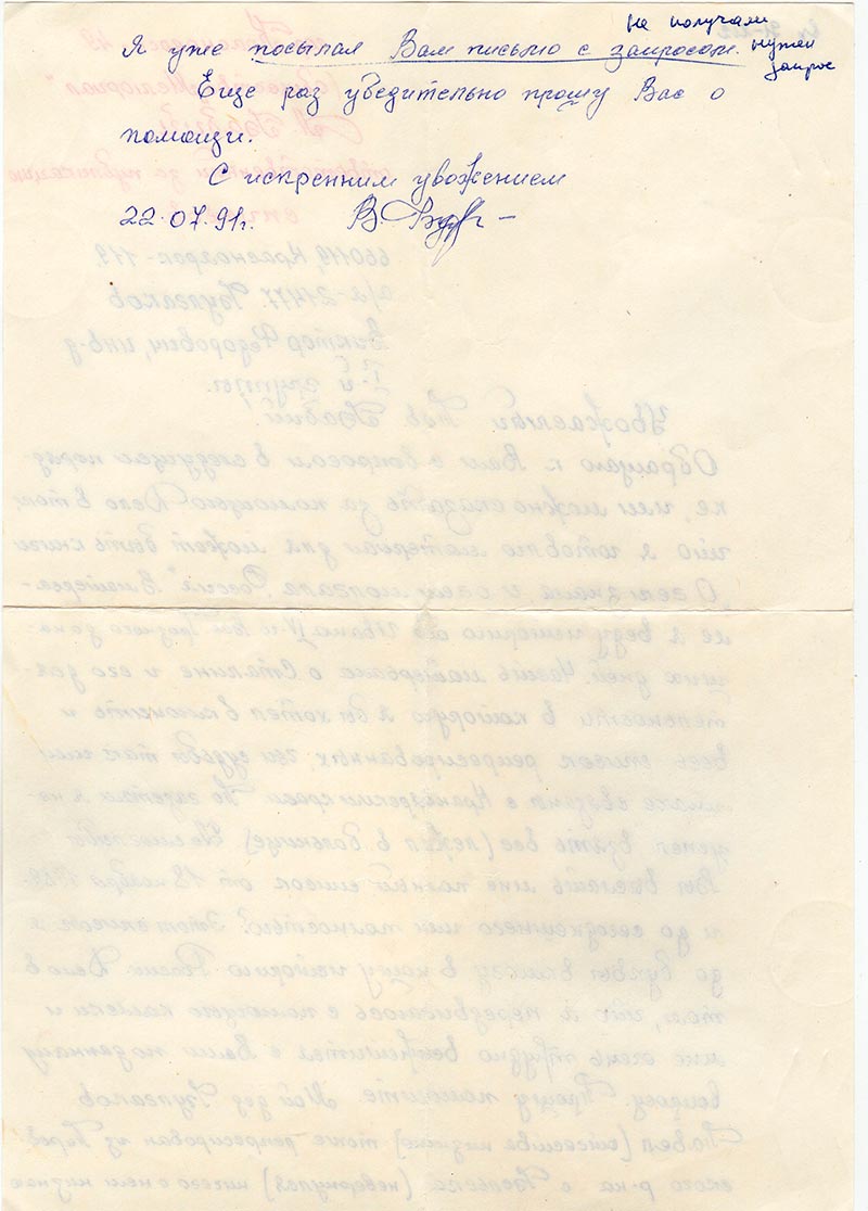 С искренним уважением Подпись. 22.07.1991 г.