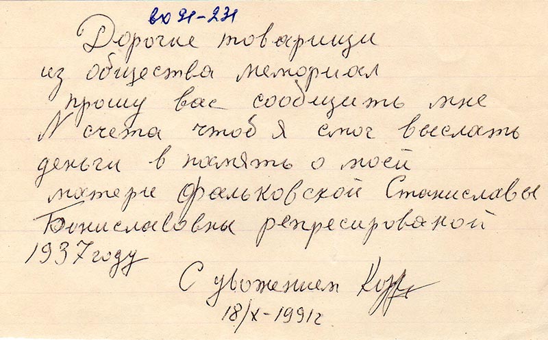 Прошу вас сообщить мне № счета чтоб я смог выслать деньги в память о моей матери Фальковской Станиславы Бониславовны репрессированной 1937 году.