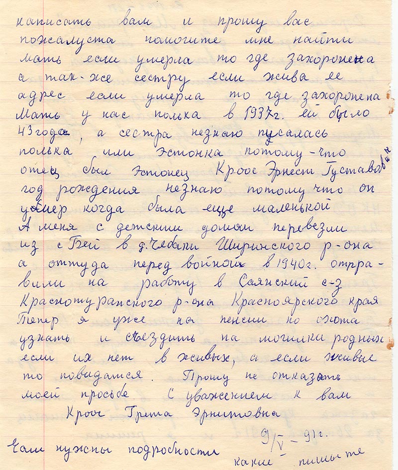 Мать у нас полька в 1937 г. ей было 43 года, а сестра незнаю писалась полька или эстонка потому что отец был эстонец Крыч Эрнест Густавович год рождения незнаю потому что он умер когда была еще маленькой.