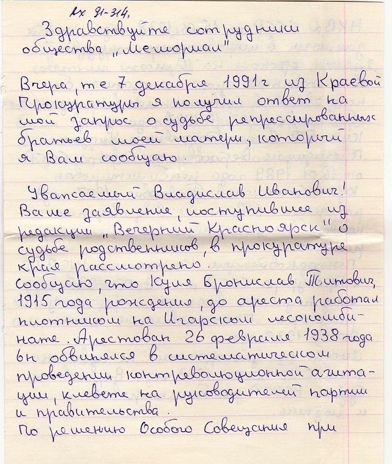 Вчера, т. Е. 7 декабря 1991 г. из Краевой Прокуратуры я получил ответ на мой запрос о судьбе репрессированных братьев моей матери, который я Вам сообщаю.