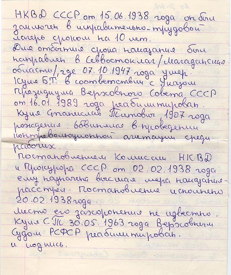 Сообщаю, что Куля Бронислав Титович, 1915 года рождения, до ареста работал плотником на Игарском лесокомбинате. Арестован 26 февраля 1938 года он обвинялся в систематическом проведении контреволюционнной агитации, клевете на руководителей партии и правительства.
