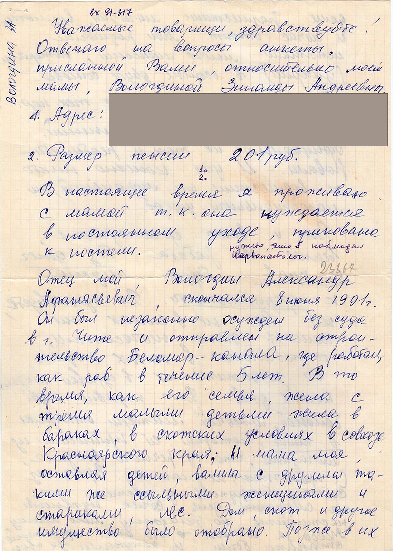 Отец мой, Вологдин Александр Афанасьевич, скончался 8 июня 1991 г. Он был незаконно осужден без суда в г. Чите и отправлен на строительство Беломор-канала, где работал, как раб в течение 5 лент. В то время, как его семья, жила с тремя малыми детьми жила в бараках, в скотских условиях в совхозе Красноярского края; И мама моя оставляя детей, валила с другими такими же ссыльными женщинами и стариками, лес. Дом, скот и другое имущество было отобрано. Позже в их доме разместили магазин, возможно и сейчас стоит. Мои родители испытали много лишений, потеряли (умерли) в ссылке двух сыновей.