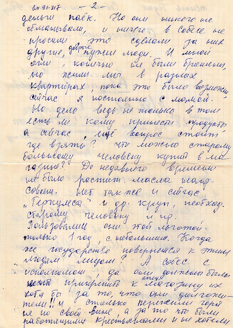 Вот и ваша организация, вернее её работа без денег и прав будет сведена к формальности. Вы существуете, но Вы не в силах ни помочь этим несчастным оставшимся в живых людях, ни защитить их в суровой жизни наших дней. Вот недавно моей больной, лежачей матери отказали в пайке, который у речного вокзала, (с крылечком, не знаю №?) Врач из собеса, обнаружив у постели дочь, на следующий день сочла нужным настыдить по телефону мою маму, якобы за обман, что они одинокие старики были и получали за свои деньги паёк. Но они никого не обманывали, и ничего в Собесе не просили, это сделали за них другие, добрые чужие люди. И мной они, конечно не были брошены, но жили мы в разных квартирах, пока это было возможно, сейчас я постоянно с мамой. Но дело ведь не только в том есть ли кому принести продукты, а сейчас, ещё вопрос стоит где взять? что можно старому больному человеку купить в магазине? До недавнего времени не было растит. масла напр. совсем. Нет так же и сейчас «Геркулеса» и др. круп, необход. старому человеку и пр.