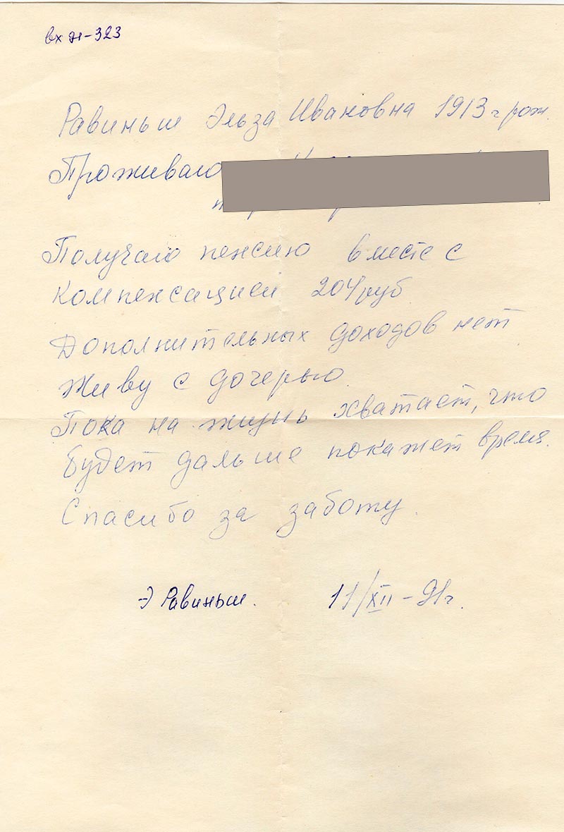 Равиньш Эльза Ивановна 1913 г. рож Получаю пенсию вместе с компенсацией 204 руб Дополнительных доходов нет Живу с дочерью Пока на жизнь хватает, что будет дальше покажет время Спасибо за заботу Э. Равиньш 11/XII – 91 г.