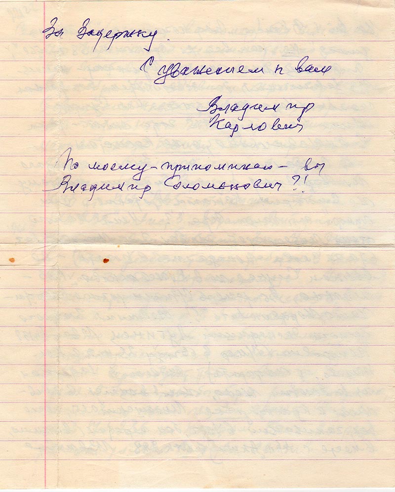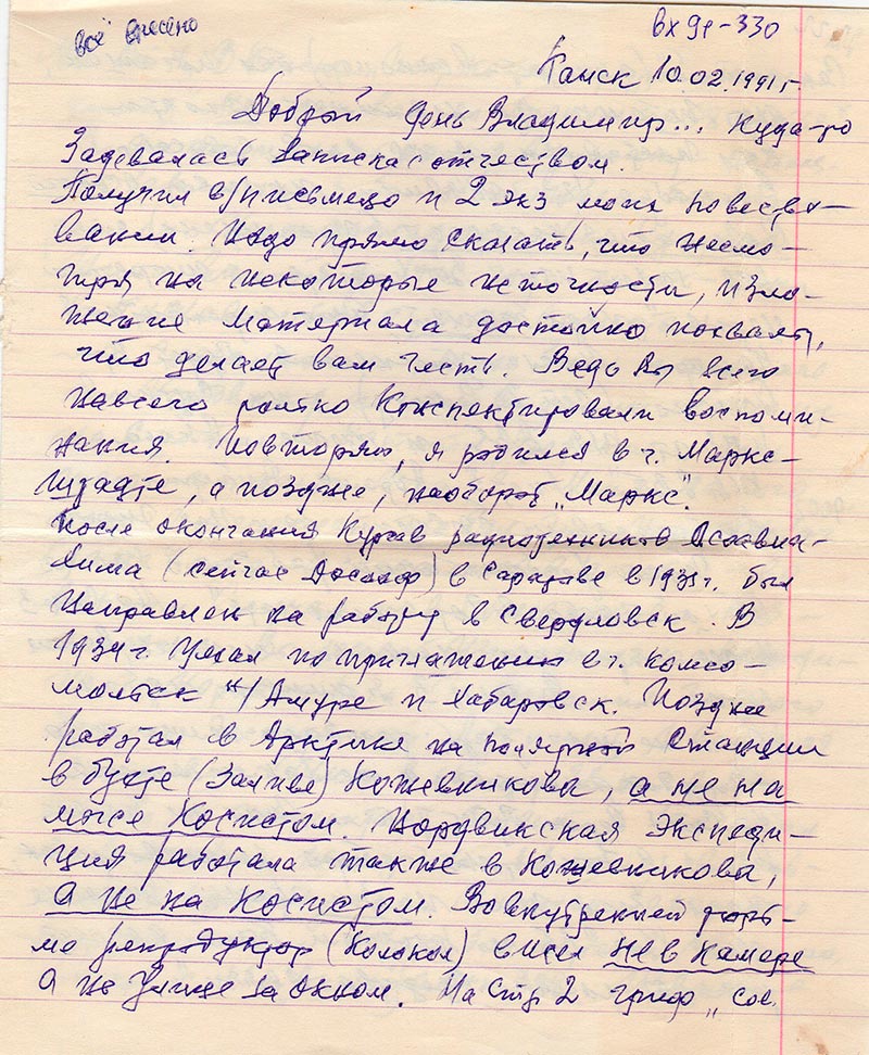 После окончания курсов радиотехников Осоавиахима (сейчас Досааф) в Саратове в 1933 г. был направлен на работу в Свердловск. В 1934 г. Уехал по приглашению в г. Комсомольск н/Амуре и Хабаровск. Позднее работал в Арктике на полярной станции в бухте (заливе) Кожевникова, а не на мысе Косистом. Нордвикская экспедиция работала также в Кожевникова, а не на Косистом. Во внутренней тюрьме репродуктор (колокол) висел не в камере а на улице за окном. На стр. 2 гриф «Сов. Секретно» (аппарат-волнометр) был погашен но штамп по невнимательности был поставлен ниже слов «сов.секр.» В декабре 42 г. объявили приговор особого Совещания НКВД СССР (пропущено) ст. АСА – 10 лет ИТЛ. Вы пишите «в тюремной церкви» надо бывшей. Это транзитная камера. После уточнения будет правильно: (ст. 2 внизу) «на сутки в КПЗ от п/я 235» и ниже «Акша п/я 235».