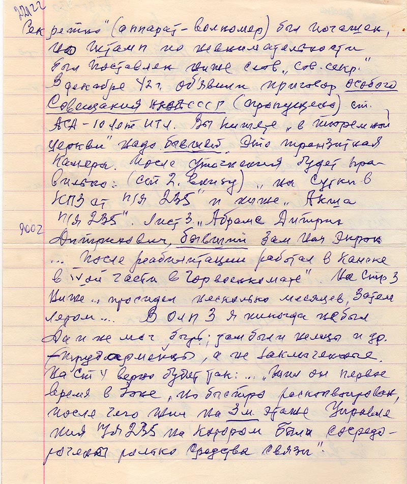 Лист 3 «Абрамс Дитрих Дитрихович бывший Зам Нач Энрок … После реабилитации работал в Канске в IVой части в Горвоенкомате». На стр 3 ниже … просидел несколько месяцев, затем летом… В ОЛП 3 я никогда не был. Да и не мог быть; там были немцы и др. трудоармейцы, а не заключенные. на ст 4 верно будет так:… «Жил он первое время в Зоке, но быстро расктвтрован, после чего жил на 3м. этаже Управления УЯ235 на котором были сосредоточены только средства связи».