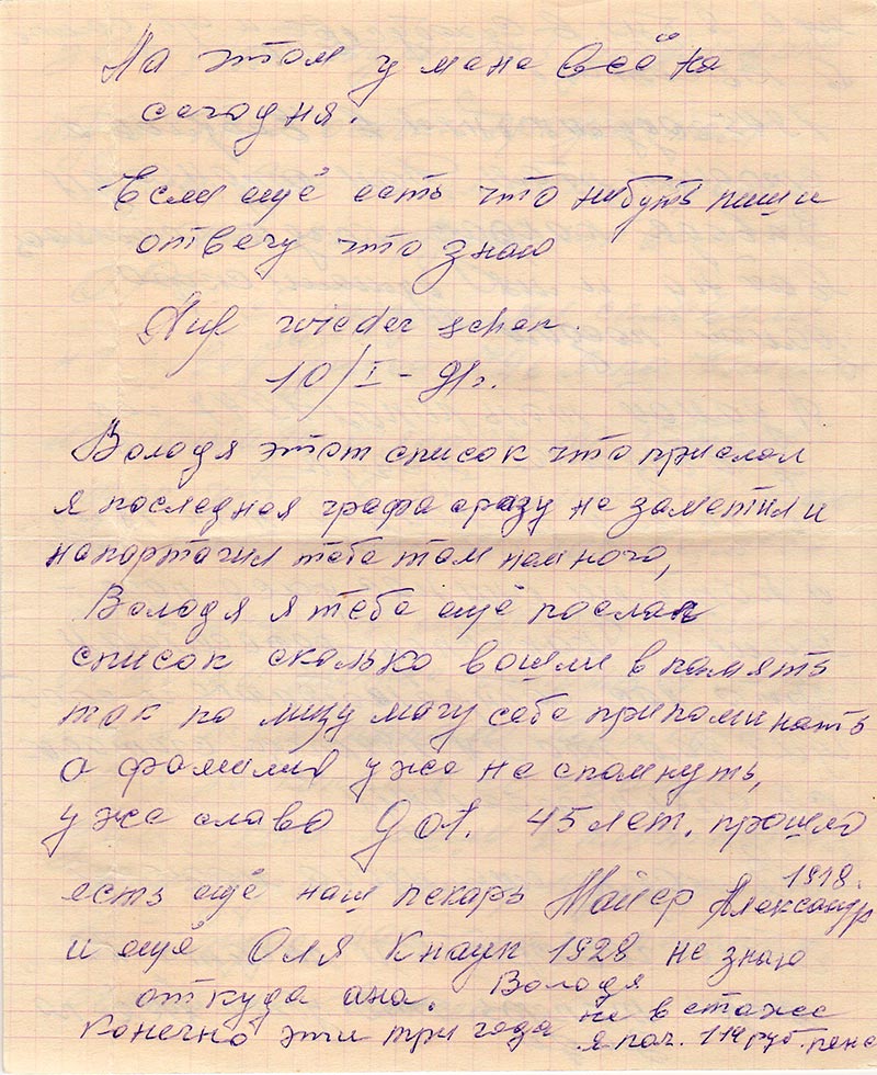 Володя этот список что прислал я последняя графа сразу не заметил и напартачил тебе там немного, Володя я тебе ещё послал список сколько вошли в память ток по лицу могу себе припоминать а фамилия уже не спомнуть, уже славо Got. 45 лет. прошло – есть еще наш пекарь Майер Александр 1918 и еще Оля Кнауп 1928 не знаю откуда ана. Володя конечно эти три года не в стаж я пач. 114 руб. пенс