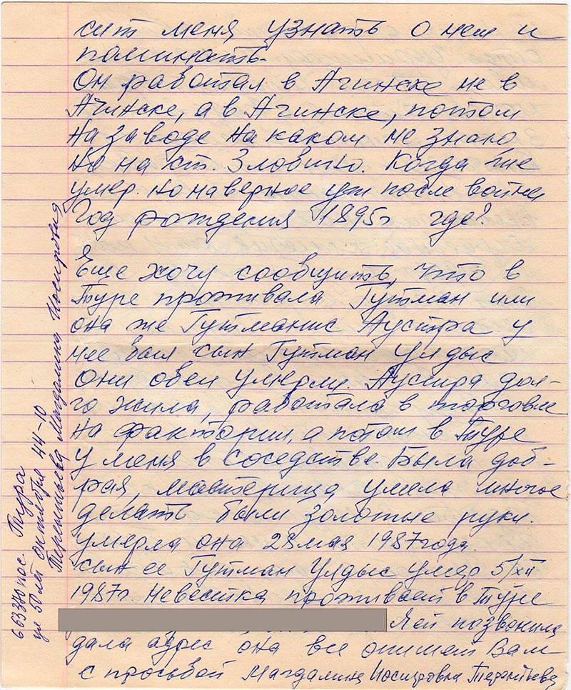 Еще хочу сообщить, что в Туре проживала Гутман или она же Гутманис Аустра у нее был сын Гутман Улдыс они обеи умерли. Аустра долго жила, работала в тоговле на фактории, а потом Туре у меня в соседстве. Была добрая, мастерица умела многое делать были золотые руки. умерла она 28 мая 1987 года. сын ее Гутман Улдыс умер 5 / XII 1987 г. Невестка проживает….