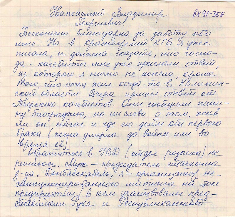 Бесконечно благодарна за заботу обо мне. Но в Красноярский КГБ я уже писала, должна сказать, что господа-кагебисты мне уже прислали ответ, из которого я ничего не поняла, кроме того, что отец жил когда-то в Калининской области. Вчера пришел ответ от Тверских кагебистов. Они сообщили папину биографию, но ни слова о том, жив ли он сейчас и где его дети от первого брака (жена умерла до войны или во время ее).