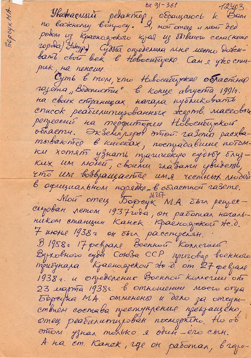 В 1958г 17 февраля военной Коллегией Верховного суда Союза ССР приговор военного трибунала Красноярской ж.д. от 27 февраля 1938г. и определение Военной Коллегии от 23 марта 1938г. в отношении моего отца Борсука М.А. отменены и дело за отсутствием состава преступления прекращено, отец реабилитирован посмертно. Но об этом узнал только я один – его сын.