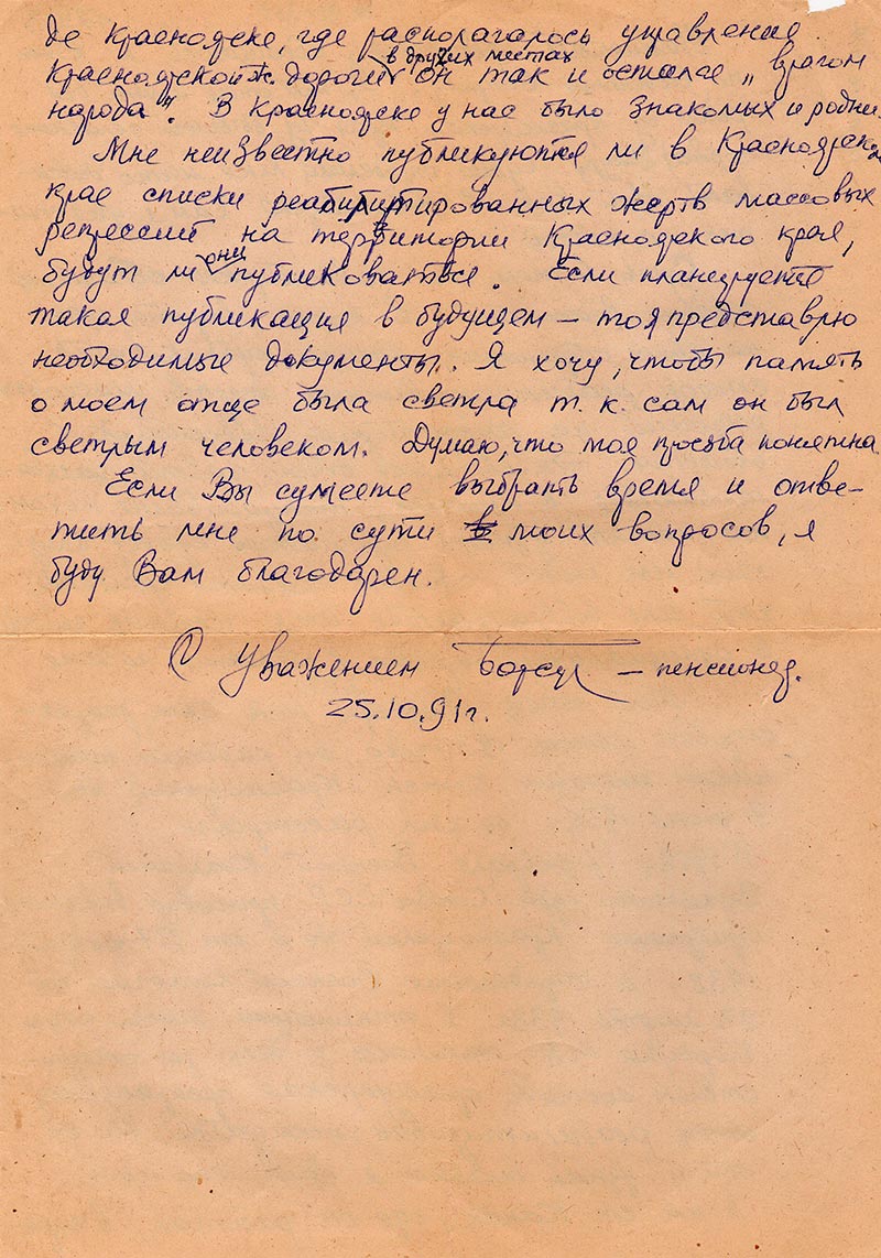 Мне неизвестно публикуются ли в Красноярском крае списки реабилитированных жертв массовых репрессий на территории Красноярского края, будут ли они публиковаться. Если планируется такая публикация в будущем – то я представлю необходимые документы. Я хочу, чтобы память о моем отце была светла, т.к. он был светлым человеком. Думаю, что моя просьба понятна.