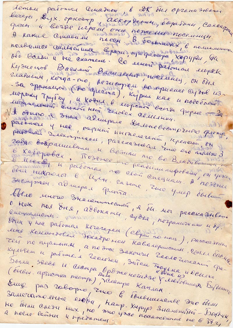 Еще раз говорю, что в большинстве это были замечательные люди, напр. хирург знаменитый – Бендик, но были среди них, но это уже посаженные не в 37 г., а после войны и предатели. Например была одна, котор. получила 8 лет и ссылку. Она работала на немцев в нашем госпитали и отравила мышьяком (ставила уколы) 32 офицера и солдат. Поймал ее главн. врач госпиталя, и из-за того, что была молодая и мать 2 девочек ей дали такой срок, а то бы расстрел.