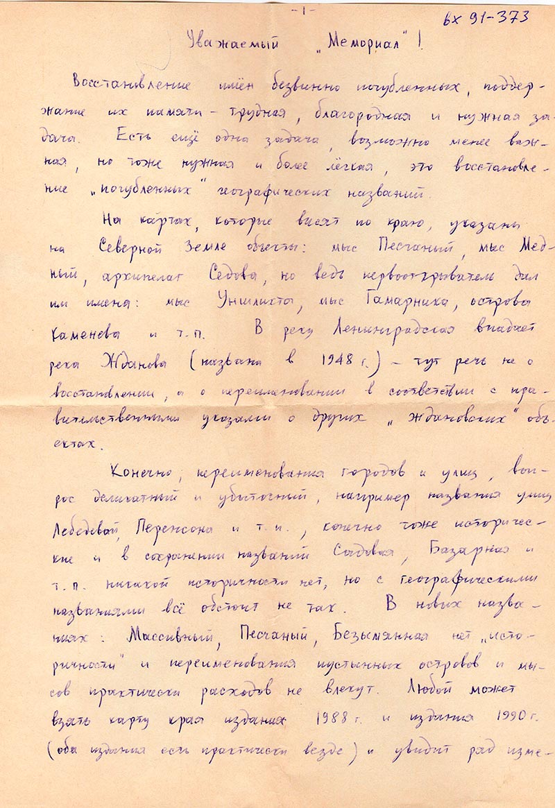 Когда «Мемориал» образовался, я написал вам аналогичное письмо, но не имея адреса, отправил его в «Красноярский рабочий» с просьбой Вам передать, если бы я точно знал, что письмо к Вам дошло, я бы сейчас не писал. В прошлом году я написал письмо для прогрессивных депутатов, могущих поднять этот вопрос и послал письмо для передачи им в «Красноярский комсомолец» т.к. я не знал, кто из депутатов может этим заняться. В «Красноярском комсомольце» мое письмо переписали (ничего не исказив) и опубликовали, но ничего не последовало. Вероятно, это показалось депутатам ненужным, либо его не заметили и конечно, теперь шумихи и политических дивидендов от таких переименований не будет, но надеюсь, у Вас цели другие.