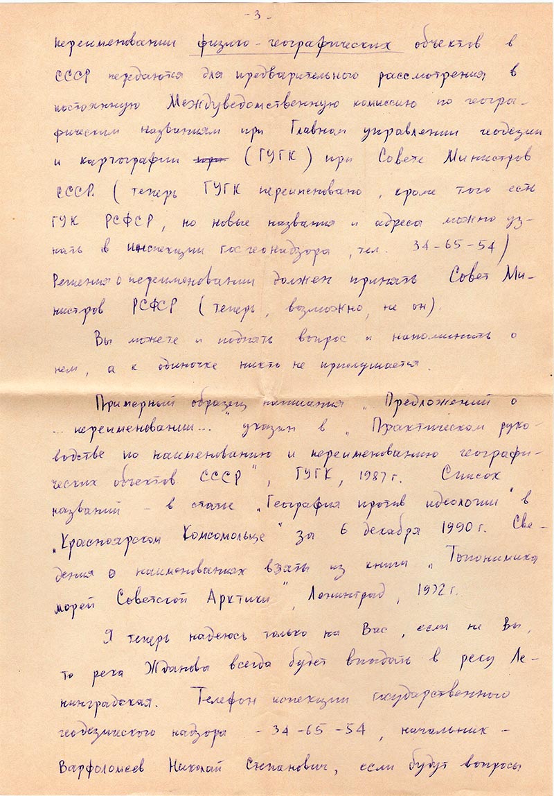 До мая 1991 г. я работал в Красноярской территориальной инспекции государственного геодезического надзора и знаю действующие тогда требования. Согласно действующим нормативным актам, предложения о переименовании физико-географических обьектов в СССР передаются для предварительного рассмотрения в постоянную Междуведомственную комиссию по географическим названиям при Главном управлении геодезии и картографии при (ГУГК) при Совете Министров СССР (теперь ГУГК переименовано, кроме того есть ГУК РСФСР, но новые названия и адреса можно узнать в инспекции Госгеонадзора, тел. 34-65-54)
