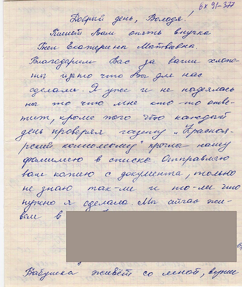 Пишет вам опять внучка Гнеп Екатерины Матвеевны. Благодарим Вас за ваши хлопоты
