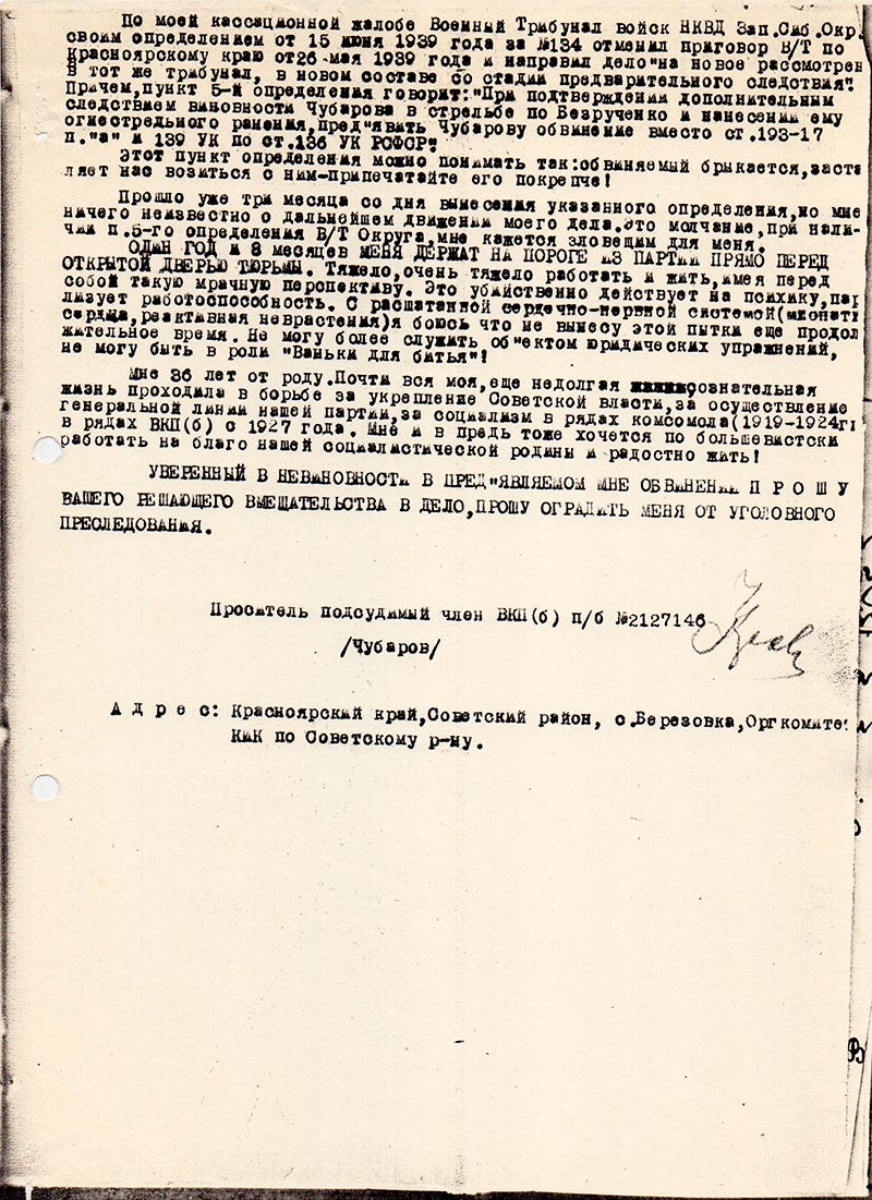 Весь состав моего преступления – состоит в незаконных арестах и превышение власти, в результате чего Военным трибуналом УПВО-НКВД КК – по ст. 193 ст.17 “а” УК – осужден 7.VI-39 к 10 годам исправительно-трудовым лагерям.