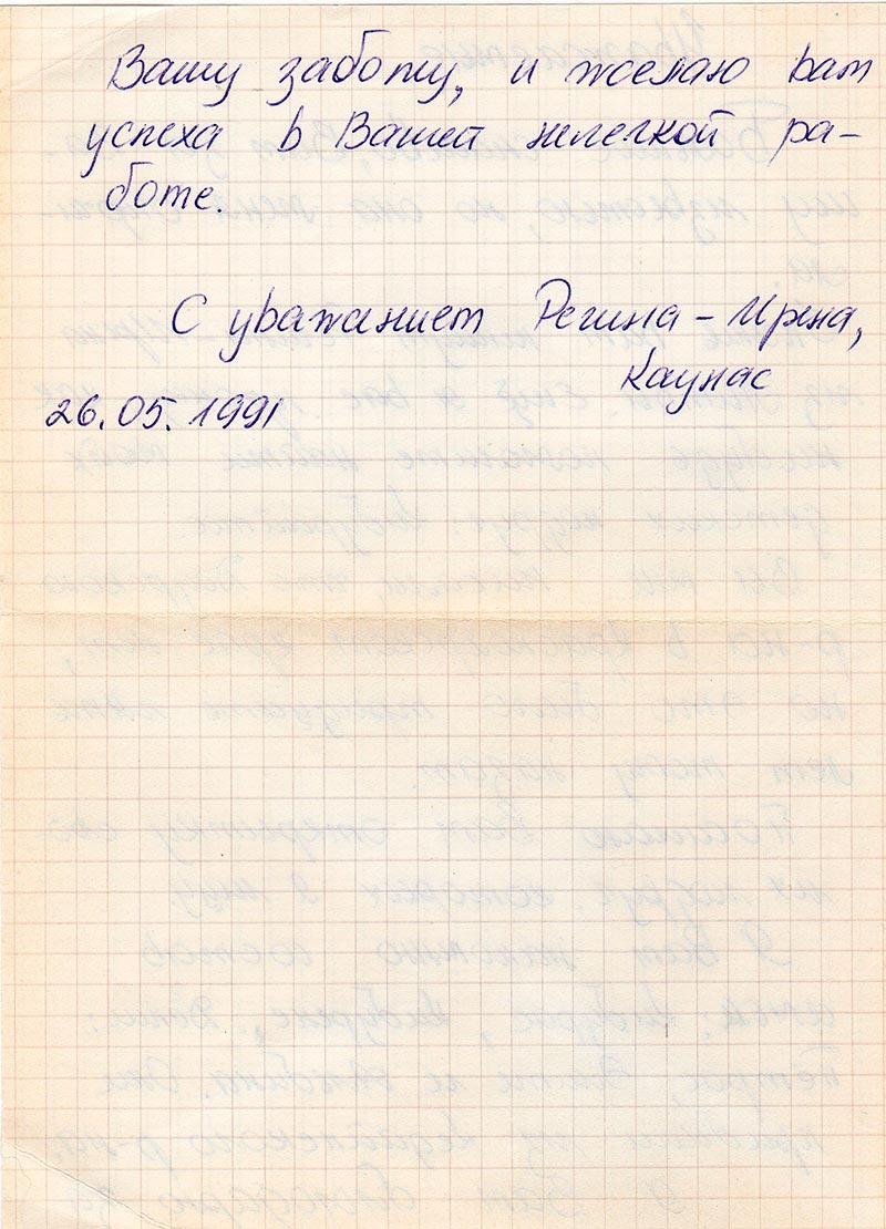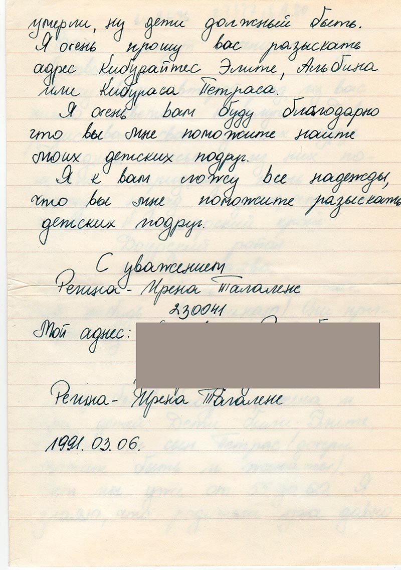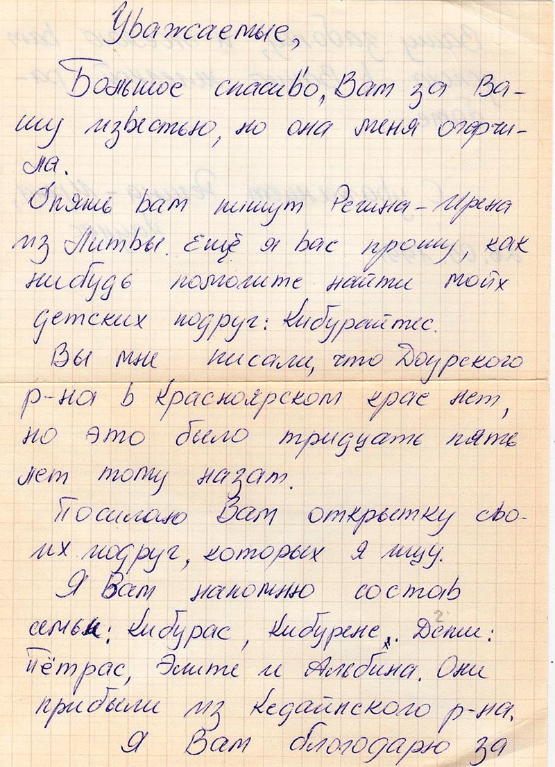 Опять вам пишут Регина-Ирена из Литвы. Еще я вас прошу, как-нибудь помогите найти моих детских подруг: Кибурайтес.