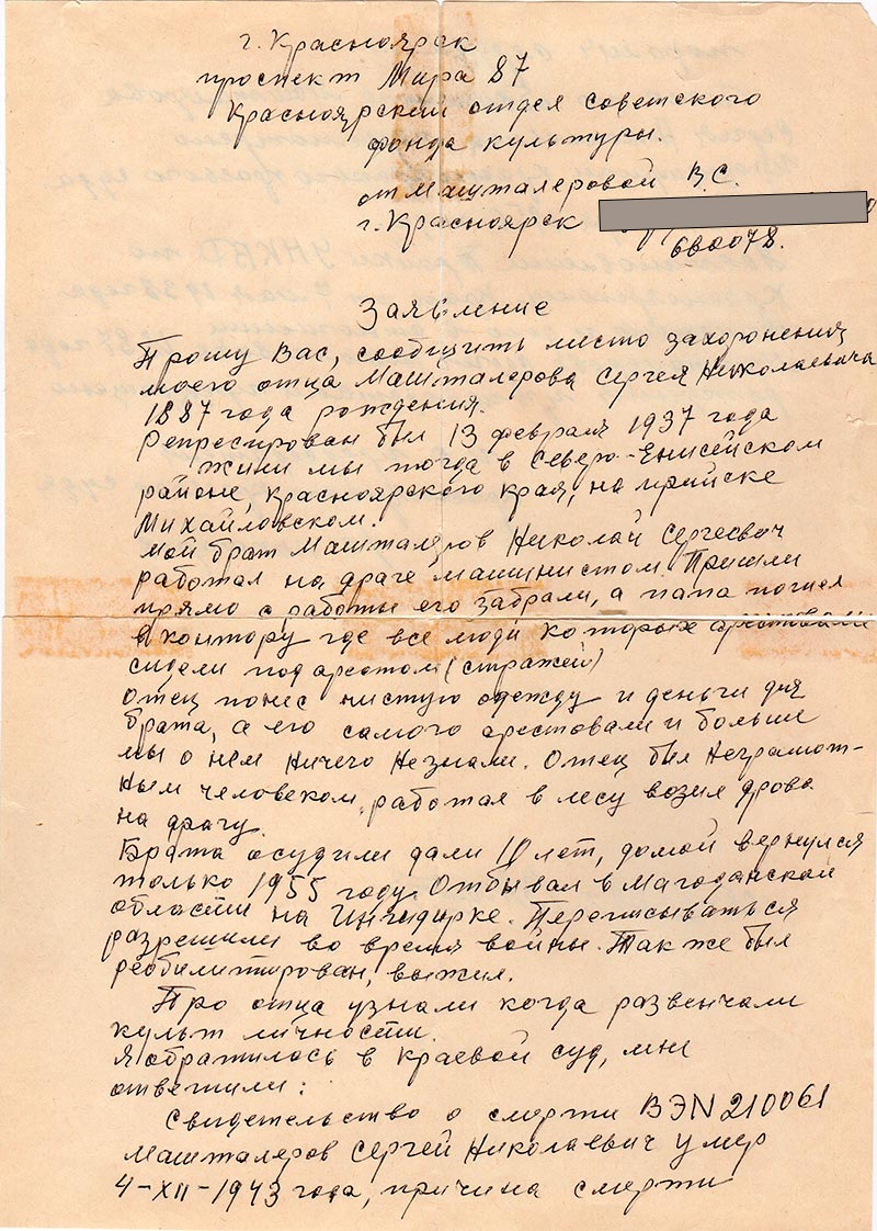 Мой брат Машталеров Николай Сергеевич работал на драге машинистом. Пришли прямо с работы его забрали, а папа пошел в контору где все люди которых арестовали сидели под арестом (стражей)