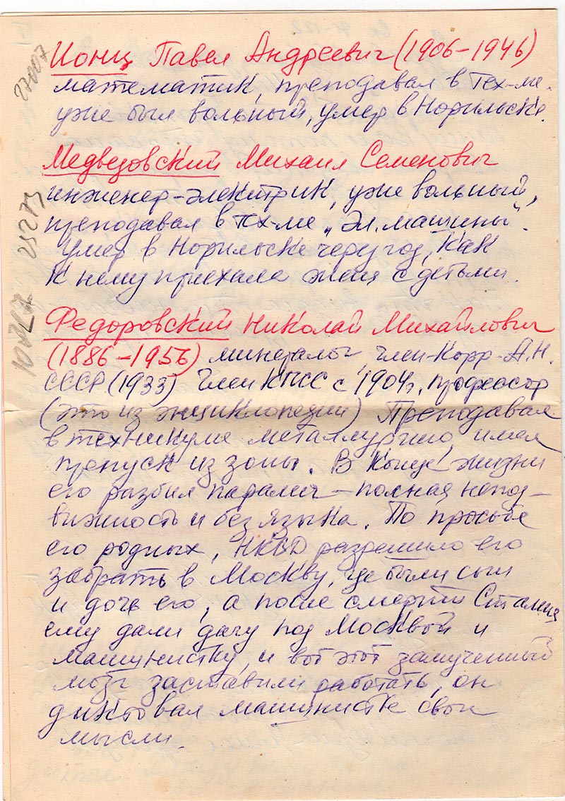 Здравствуйте, уважаемые товарищи из «Мемориала»! Постораюсь быть краткой. Пишу Вам потому, что сама собираю сведения о репрессированных и еще потому, что с 1944 г. по 1960 жила в Норильске, где в 1944-47 училась в Горно-Металлург. техникуме и работала там до 1960 г. Так что видела этих несчастных людей воочию, училась и работала с ними, и хочу сообщить Вам о тех, кого я лично знала и видела.