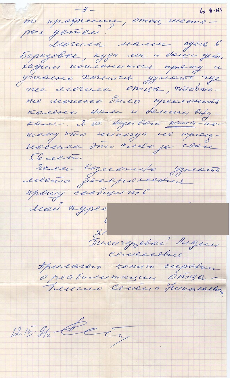 А когда мы все стали взрослыми то нам морально необходимо было знать где же наш отец?а матери её муж? После запросов мы получили сведения о реабилитации посмертно.