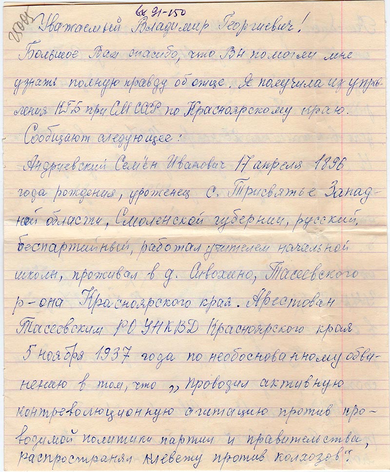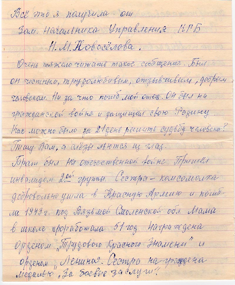 Большое Вам спасибо, что Вы помогли мне узнать полную правду об отце. Я получила их управления КГБ при СМ СССР по Красноярскому краю.