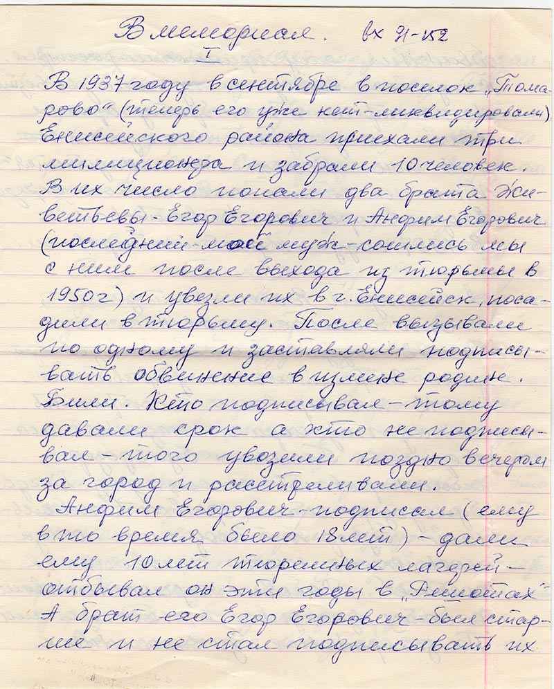 Анфим Егорович подписал (ему в то время было 18 лет) – дали ему 10 лет тюремных лагерей – отбывал он эти годы в «Решотах». А брат его Егор Егорович – был старше и не стал подписывать их обвинения – ему приписали – расстрел.