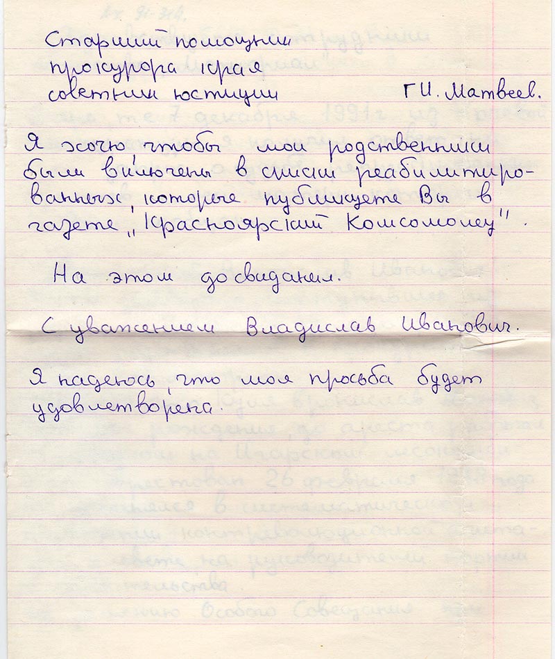 Я хочу, чтобы мои родственники были включены в списки реабилитированных, которые публикуете Вы в газете «Красноярский Комсомолец».