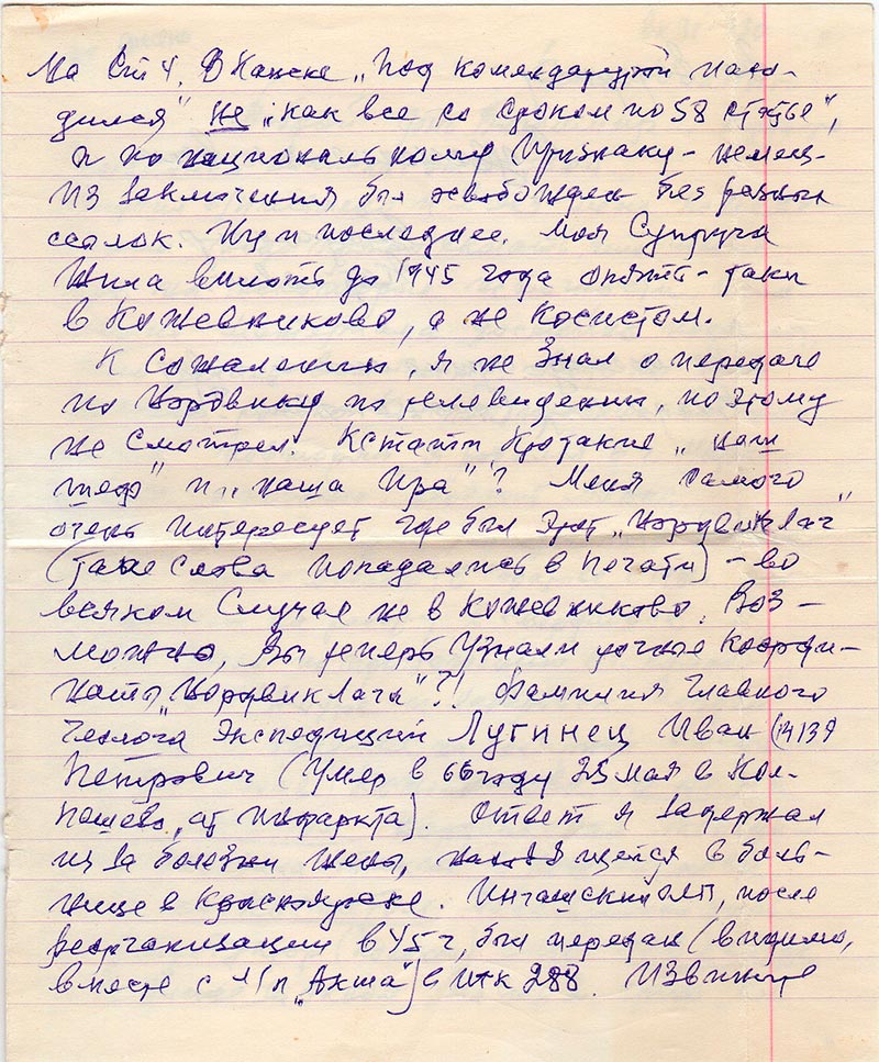 К сожалению я не знал о передаче по Нордвику по телевидению, поэтому не смотрел. Кстати кто такие «наш шеф» и «наша Ира»? Меня самого очень интересует где был этот «НордвигЛаг» (такие слова попадались в печати) – во всяком случае не в Кожевниково. Возможно, Вы теперь узнали точные координаты «НордвикЛага»?! Фамилия главного геолога экспедиций Лугинец Иван Петрович (умер в 66 году 25 мая в Колпашево, от инфаркта). Ответ я задержал из за болезни жены, находящейся в больнице в Красноярске. Ингашским ОЛП, после реорганизации в 45 г, был передан (видимо, вместе с л/п «Акша») в ИТК 288. Извините за задержку.