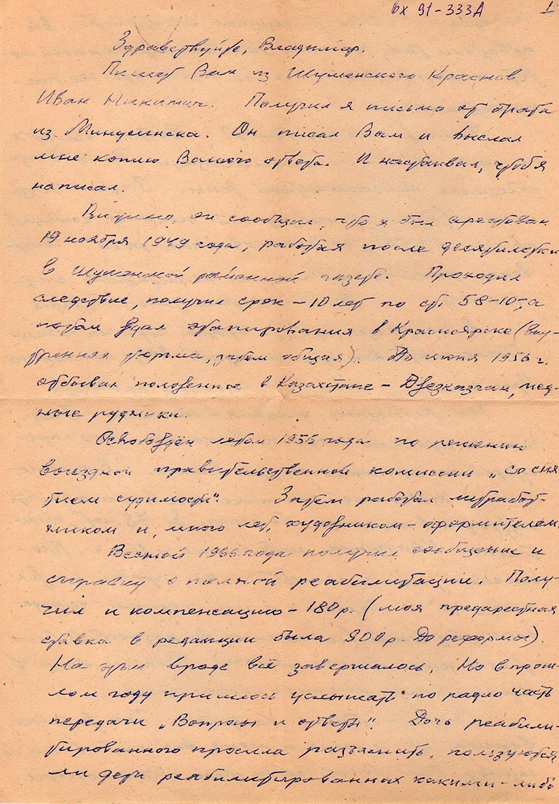 Видимо, он сообщил, что я был арестован 19 ноября 1949 года, работая после десятилетки в Шушенской районной газете. Проходил следствие, получил срок – 10 лет по ст. 58-10, а потом ждал этапирования в Красноярске (внутренняя тюрьма, затем общая). До июня 1956 г. отбывал положенное в Казахстане – Джезказган, медные рудники.