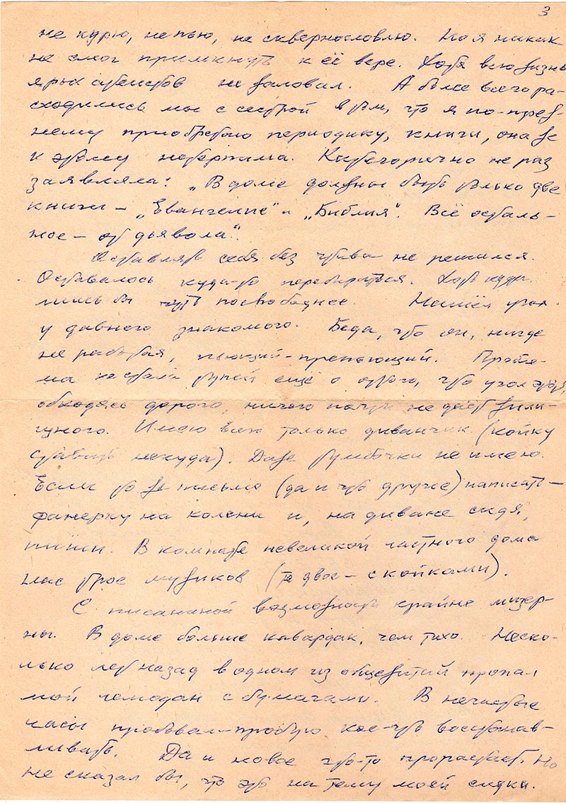 Но жилищные условия – никакие. 3 года, как я переехал сюда их Хакасии. Здесь – престарелая одинокая сестра. Родная. в заявлении в ЖЭК о моей прописке она написала, что нуждается в помощи по уходу. Ей 78 лет, очень больна. Квартира небольшая – 16 м2. прописали, но с пометкойй: «без права на жилплощадь». Переехал к ней с одним чемоданом, без вещей (их не смог бы разместить. Одних только книг больше тысячи). Оставил вещи в хранилище минусинского брата.
