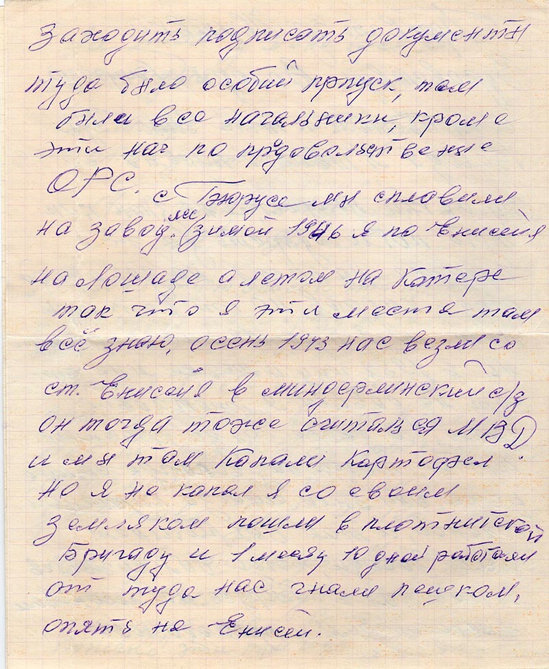 с Бюрусе мы сплавили на завод лес (зимой 1946 я по Енисейя на лошаде а летом на катере так что я эти места там всё знаю, осень 1943 нас везли со ст. Енисейя в Миндерлинский с/з он тогда тоже считался МВД. и мы там копали Картофел. но я не капал я со своим земляком пошли в плотнитской Бригаду и 1 месяц 10 дней работали от туда нас гнали пешком опять на Енисей.