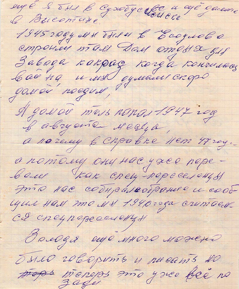 1945 году мы были в Есоуловке (прим.: Есауловка) строили там Дом отдых для Завода какраз когда кончилась война, и мы думали скоро домой поедим.