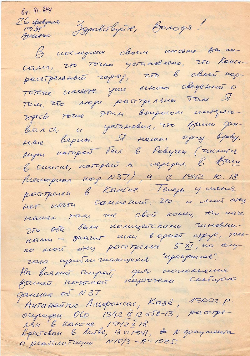 В последнем соем письме Вы писали, что точно установлено, что Канск — расстрельный город, что в своем кортотеке имеете уже много сведений о том, что люди расстреляны там. Я здесь тоже этим вопросом интересовался и установил, что Ваши данные верны. Я нашел одну вдову, муж которой был в Ревучем (числится в списке, который я передал в Ваш Мемориал код №37), а в 1942 10.18 расстрелян в Канске. Теперь у меня нет почти сомнений, что и мой отец нашел там же свой конец, тем паче что оба были полицейскими чиновниками — значит шли в одной струе, только мой отец расстрелян 5 XI, по случаю приближающихся «праздников». На всякий случай, для пополнения вашей канской картотеки сообщаю данные об №37