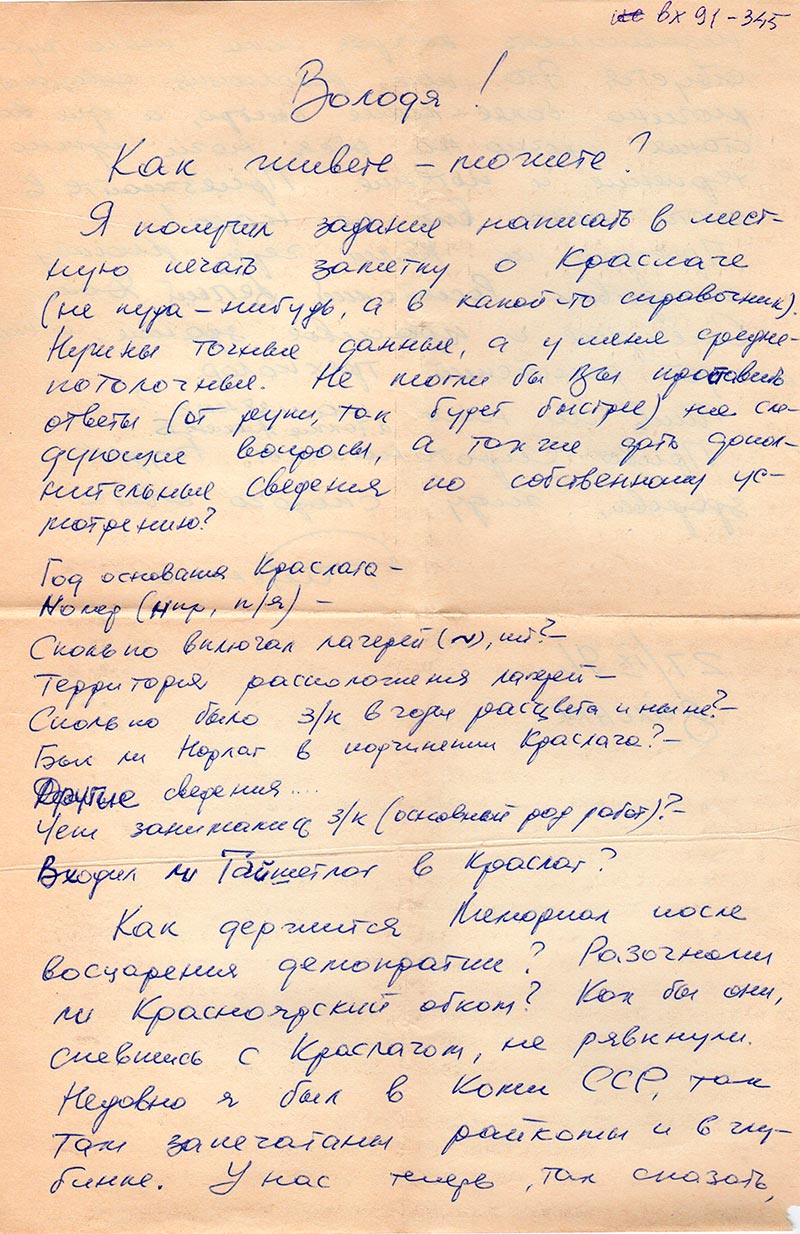Я получил задание написать в местную печать заметку о Краслаге (не куда-нибудь, а в какой-то справочник). Нужны точные данные, а у меня среднепотолочные. Не могли бы вы проставить ответы (от руки, так будет быстрее) на следующие вопросы, а также дать дополнительные сведения по собственному усмотрению?