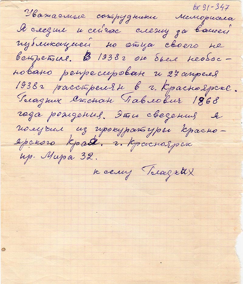 Красноярске. Гладких Степан Павлович 1868 года рождения. Эти сведения я получил