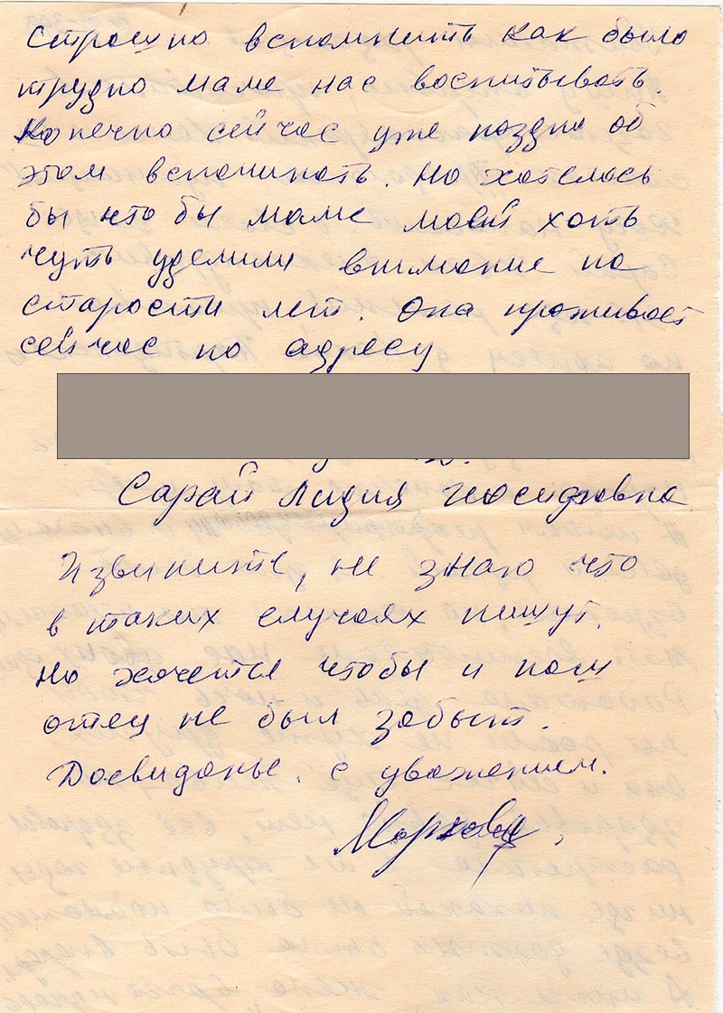 Страшно вспомнить как было трудно маме нас воспитывать. Конечно сейчас уже поздно об этом вспоминать. Но хотелось бы что бы маме моей хоть чуть уделили внимание на старости лет. Она проживает сейчас сейчас по адресу