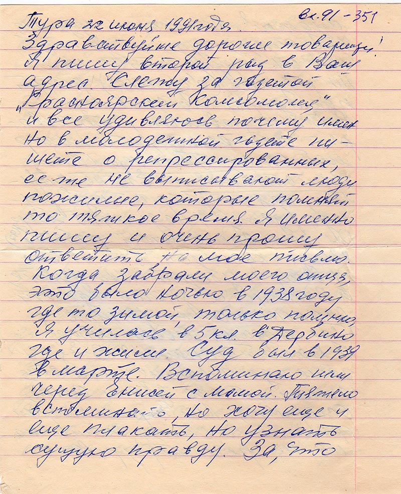 Я пишу второй раз в Ваш адрес. Слежу за газетой «Красноярский Комсомолец» и все удивляюсь почему именно в молодежной газете пишете о репрессированных, ее же не выписывают люди пожилые, которые помнят то тяжкое время. Я именно пишу и прошу ответить на мое письмо. Когда забрали моего отца, это было ночью в 1938 году где-то зимой, только помню, я училась в 5 кл. в Деребино где и жили. Суд был в 1939 в марте. Вспоминаю шли через Енисей с мамой. Тяжело вспоминать, но хочу еще и еще плакать, но узнать сущую правду. За, что судили? От мамы узнала, что отца судили за то, что он сказал, что у него на родине (а где она?) растут памидоры по чайнику. Вот я и сравниваю, что говорят сейчас и за, что помер мой отец Гесслер Иосиф Христианович. Его не стреляли, нет он умер от туберкулеза (дату я не знаю, но хочу знать). Он был специалист работал 23 года кузнецом. Дак я Вас прошу и убедительно узнайте, а Вам легче знать где эти данные можно узнать