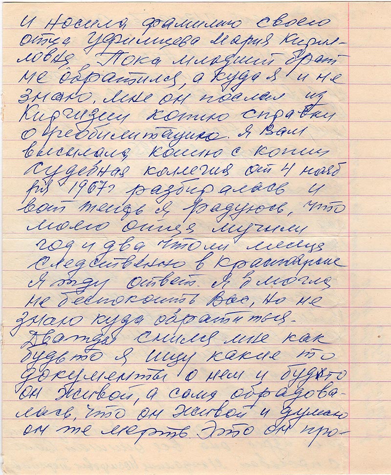 Где родина моего отца? и какой он нации?? В Езагаше где женился мой отец с мамой его звали Оська Острияка. Мы трое носили фамилию отца, хоть мама не регистрирована и носила фамилию своего отца Уфимцева Мария Кирилловна. Пока младший брат не обратился, а куда я и не знаю. Мне он послал из Киргизии копию справки о реобилитацию. Я Вам высылала копию с копии судебная коллегия от 4 ноября 1967 г. разбиралась и вот теперь я радуюсь, что моего отца мучили год и два, чтоли месяца следственно в Красноярске Я жду ответ. Я б могла не беспокоить Вас, но не знаю куда обратиться. Дважды снился мне как будьто я ищу какие то документы о нем и будьто он живой, а сама обрадовалась, что он живой и думаю он же мертв. Это он просит меня узнать о нет и поминать.