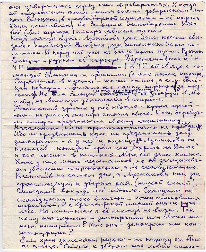Лусникова сделала карьеру на критике Сталинизма. Но она стала критиковать Сталина только тогда, когда на это дал добро – генсек Горбачёв. Тоесть она поддержала руководство своей песней. Решив что настал её звёздный час. Когда Сталина критиковать было опасно Лусникова молчала. Став демократом не в борьбе за права человека, демократические принципы – а именно на коньюнктурной теме. Она никогда не пёрла поперёк руководства – ломали в борьбе рёбра и головы другие. Лусникова всегда играла там, где кон был наверняка и проиграть было невозможно. Я не говорю о том, что «Мемориал» сделав её депутатом, пресмыкается почему-то перед ней как шавка. Или «Мемориалу» нужны идолы для преклонения? Она не имея своей позиции и принципов – имея позицию и принципы Горбачёва и других, сильных мира сего (ради карьеры – звёздного часа) проявила свою ???? преданность их курсу и исполнительность. Чем была и замечена командой Ельцина. Хотя когда Ельцина били – Лусникова молчала и выжидала, а когда же он стал сильным мира сего она завертелась перед ним в реверансах. И когда ей предложили этим летом стать доверенным лицом Ельцина, в предвыборной компании – её карта была поставлена на Ельцина бесповоротно. Ибо всё (вся карьера) теперь зависела от него.