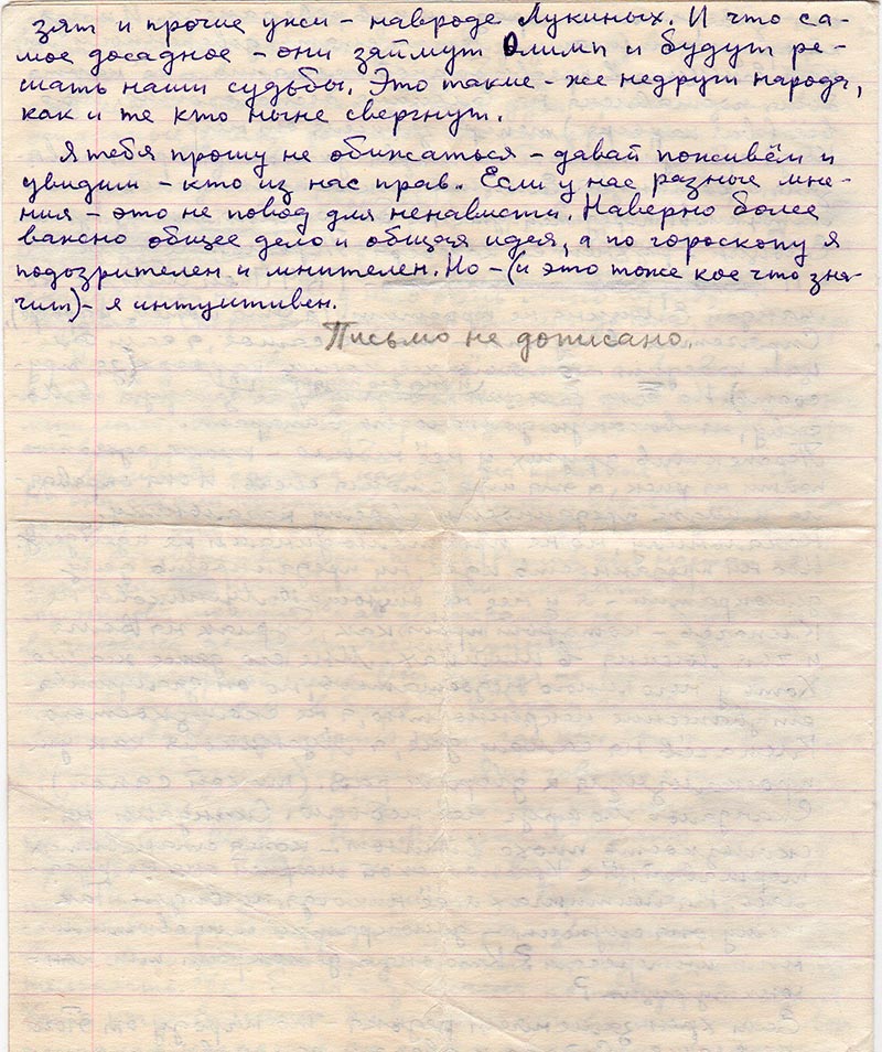 Я тебя прошу не обижаться – давай поживём и увидим – кто из нас прав. Если у нас разные мнения – это не повод для ненависти. Наверно более важно общее дело и общая идея, а по гороскопу я подозрителен и мнителен. Но – (и это тоже кое что значит) я интуитивен.