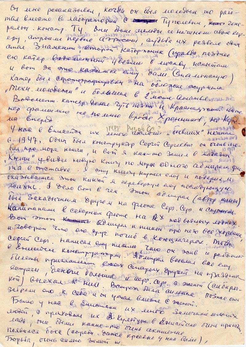 У нас в Енисейск их много (прим. 11488 Рузов СС?) сослали «бывших» начиная с 1947 г. Один был конструктор Сергей Сергеевич он очень любил про море книги, и вот я как-то зашел в магазин «Книги» увидел новую книгу по морю одного адмирала флота в отставке. Я эту книгу купил ему и подарил ее оказывается этой книгой я перевернул ему последующую жизнь. А дело вот в чем. Этот адмирал (автор книги) был закадычным другом на флоте Серг. Серг и служили капитанами в северном флоте на 2х подводных лодках. Вот этот адмирал и пишет про него все хорошее, и говорит, что его друг погиб в концлагерях. Тогда Сергей Серг. написал ему письмо, что он жив и работает в Енисейске конструкторм. Адмирал выслал все ему билеты приглашении всех старых друзей на праздник встречи, деньги большие и Серг. Серг. с женой (сибирячкой) выехал к ним. Встреча была сильная. Позже они забрали его к себе и он уехал вместе с женой.