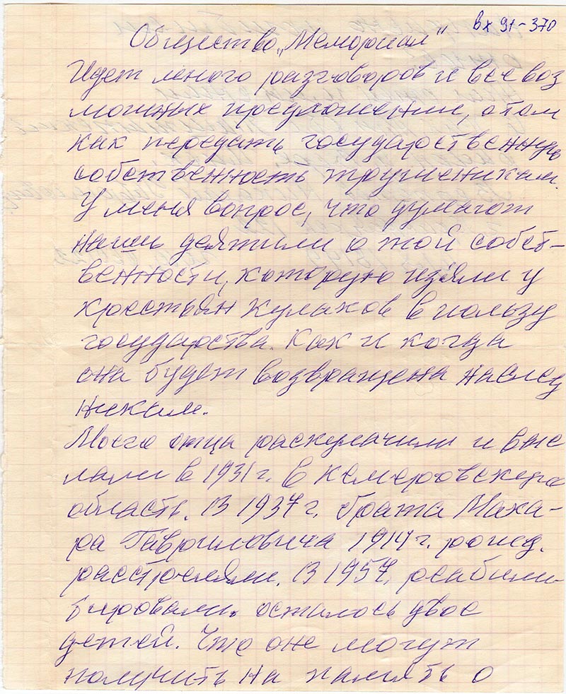 Идет много разговоров и всевозможных предложений, о том, как передать государственную собственность труженикам. У меня вопрос, что думают наши деятели о той собственности, которую изъяли у крестьян-кулаков в пользу государства. Как и когда она будет возвращена наследникам.