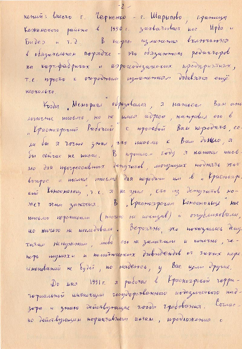 Когда «Мемориал» образовался, я написал вам аналогичное письмо, но не имея адреса, отправил его в «Красноярский рабочий» с просьбой Вам передать, если бы я точно знал, что письмо к Вам дошло, я бы сейчас не писал. В прошлом году я написал письмо для прогрессивных депутатов, могущих поднять этот вопрос и послал письмо для передачи им в «Красноярский комсомолец» т.к. я не знал, кто из депутатов может этим заняться. В «Красноярском комсомольце» мое письмо переписали (ничего не исказив) и опубликовали, но ничего не последовало. Вероятно, это показалось депутатам ненужным, либо его не заметили и конечно, теперь шумихи и политических дивидендов от таких переименований не будет, но надеюсь, у Вас цели другие.