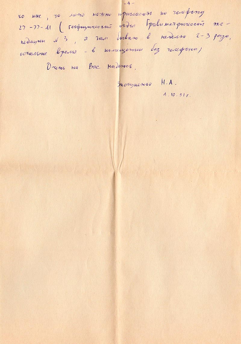 Я теперь надеюсь только на Вас, если не Вы, то река Жданова всегда будет впадать в реку Ленинградская. Телефон инспекции государственного геодезического надзора 34-65-54, начальник- Варфоломеев Николай Степанович, если будут вопросы ко мне, то меня можно пригласить по телефону 27-77-41 (геодезический отдел Гравиметрической экспедиции № 3, я там бываю в неделю 2-3 раза, остальное время- в помещении без телефона).