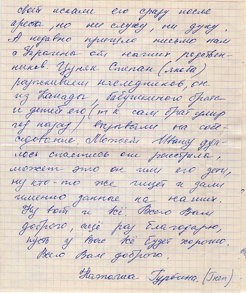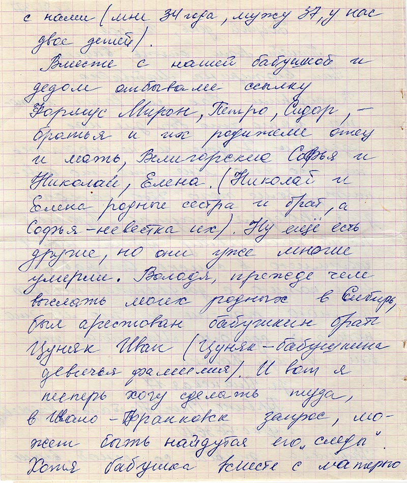 Вместе с нашей бабушкой и дедом отбывали ссылку Формус Мирон, Петро, Сидор, -братья и их родители отец и мать, Велигорские Софья и Николай, Елена (Николай и Елена – родные сестра и брат, а Софья невестка их). Ну еще есть другие, но они уже многие умерли. Володя, прежде чем выслать моих родных в Сибирь, был арестован бабушкин брат Цуняк Иван (Цуняк – бабушкина девичья фамилия). И вот я теперь хочу сделать туда, в Ивано-Франковск запрос, может быть найдутся его «следы». Хотя бабушка вместе с матерью своей искали его сразу после ареста, но ни слуху, ни духу. А недавно пришло письмо нам с Украины от наших родственников. Цуняк Степан (якобы) разыскивает наследников, он из Канады, бабушкиного брата и детей его( так как сам брат умер год назад) вызывали на собеседование. Может Ивану удалось спастись от расстрела, может это он или его дети, но кто-то же ищет и дали именно данные на наших. Ну вот и все. Всего Вам доброго, еще раз благодарю, пусть у Вас все будет хорошо. Всего Вам доброго.