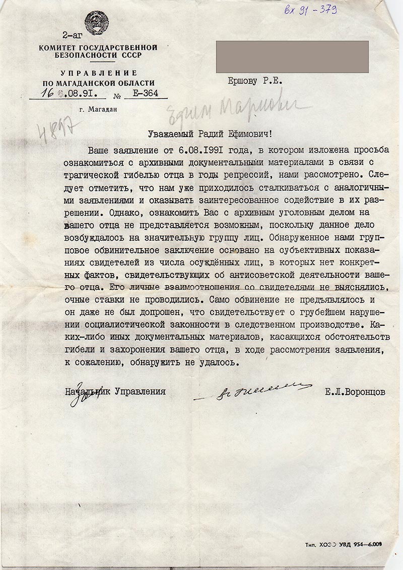 Ваше заявление от 6.08.1991 года, в котором изложена просьба ознакомиться с архивными документальными материалами в связи с трагической гибелью отца в годы репрессий, нами рассмотрено. Следует отметить, что нам уже приходилось сталкиваться в аналогичными заявлениями и оказывать заинтересованное содействие в их разрешении. Однако, ознакомить Вас с архивным уголовным делом на вашего отца не представляется возможным, поскольку данное дело возбуждалось на значительную группу лиц. Обнаруженное нами групповое обвинительное заключение основано на субъективных показаниях свидетелей из числа осуждённых лиц, в которых нет конкретных фактов, свидетельствующих об антисоветской деятельности вашего отца. Его личные взаимоотношения со свидетелями не выяснялись, очные ставки не проводились. Само обвинение не предъявлялось, и он даже не был допрошен, что свидетельствует о грубейшем нарушении социалистической законности в следственном производстве. Каких-либо иных документальных материалов, касающихся обстоятельств гибели и захоронения вашего отца, в ходе рассмотрения заявления, к сожалению, обнаружить не удалось.