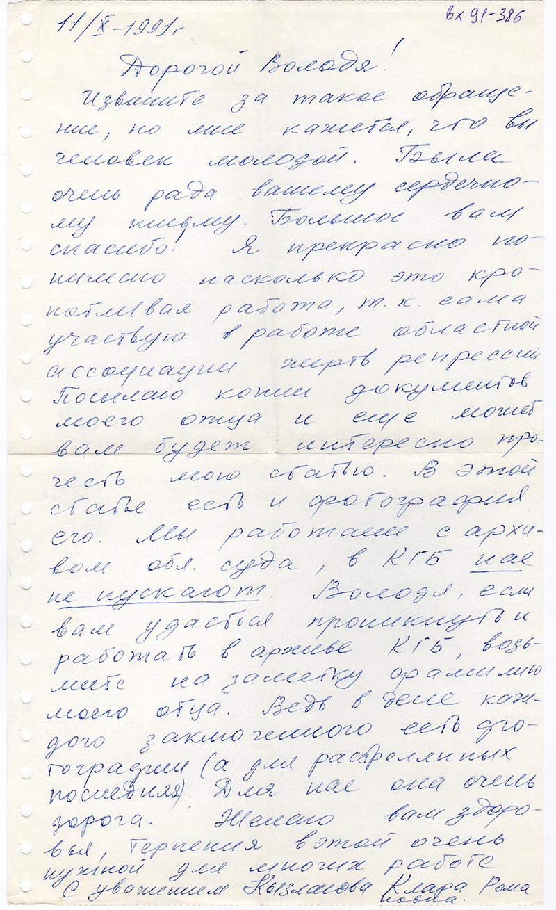 Извините за такое обращение, но мне кажется, что вы человек молодой. Была очень рада вашему сердечному письму. Большое вам спасибо! Я прекрасно понимаю насколько это кропотливая работа, т.к. сама участвую в работе областной ассоциации жертв репрессий. Посылаю копии документов моего отца и еще может вам будет интересно прочесть мою статью. В этой статье есть и фотография его. Мы работали с архивом обл. суда, в КГБ нес не пускают. Володя, если вам удасться проникнуть и работать в архиве КГБ, возьмите на заметку фамилию моего отца. Ведь в деле каждого заключенного есть фотографии (а для расстрелянных последняя). Для нас она очень дорога. Желаю вам здоровья, терпения в этой очень нужной для многих работе.